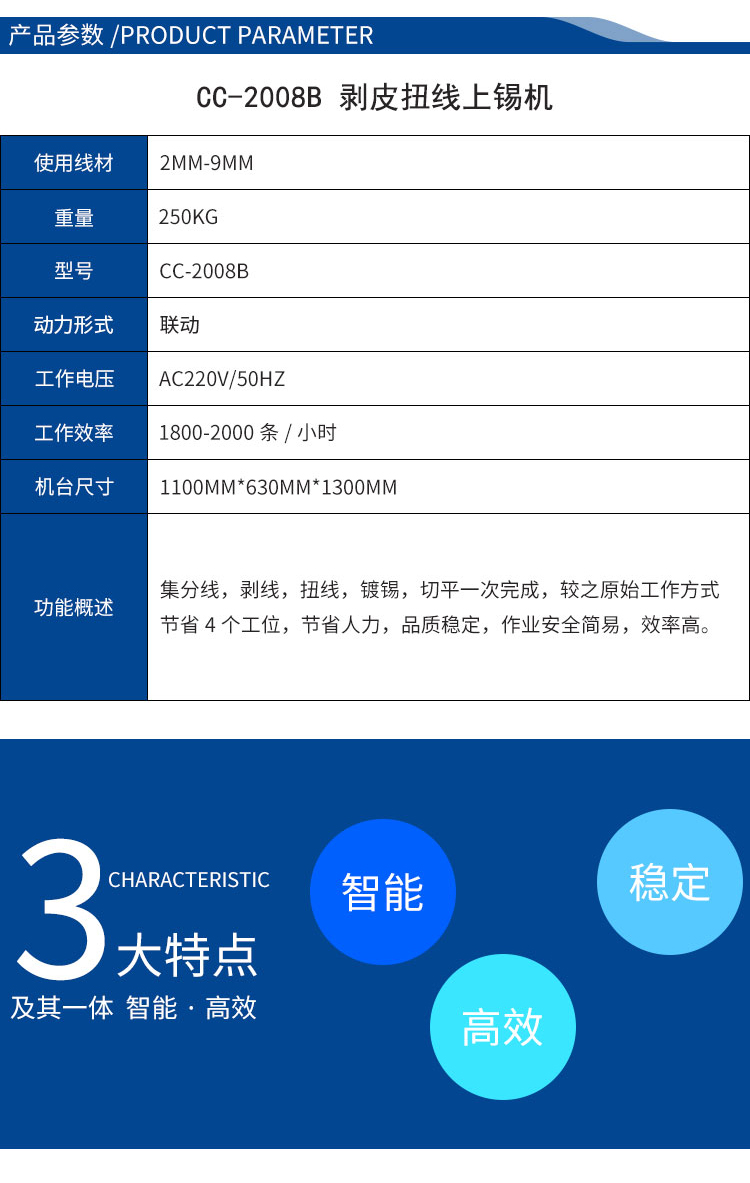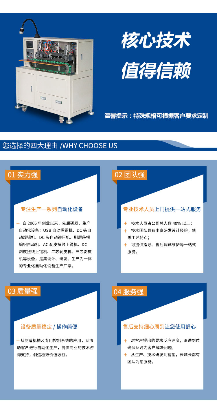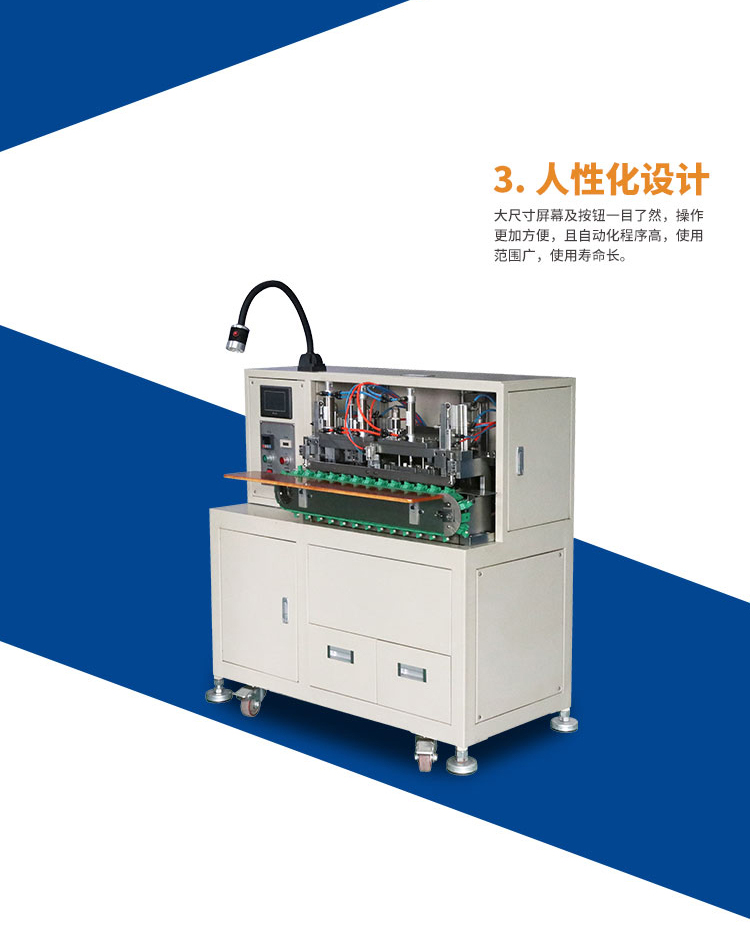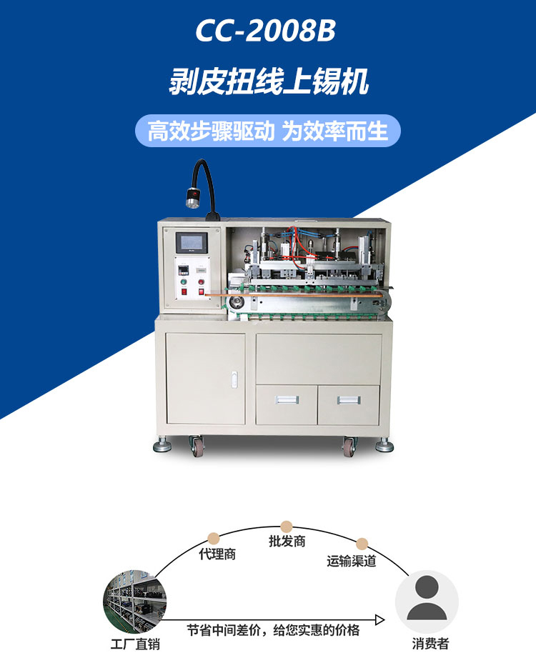 產(chǎn)品介紹:集分線、剝線、扭線、鍍錫、切平、一次完成,品質(zhì)穩(wěn)定,操作簡(jiǎn)單,效率高,較之原始工作方式節(jié)省4個(gè)工位,提高效率。